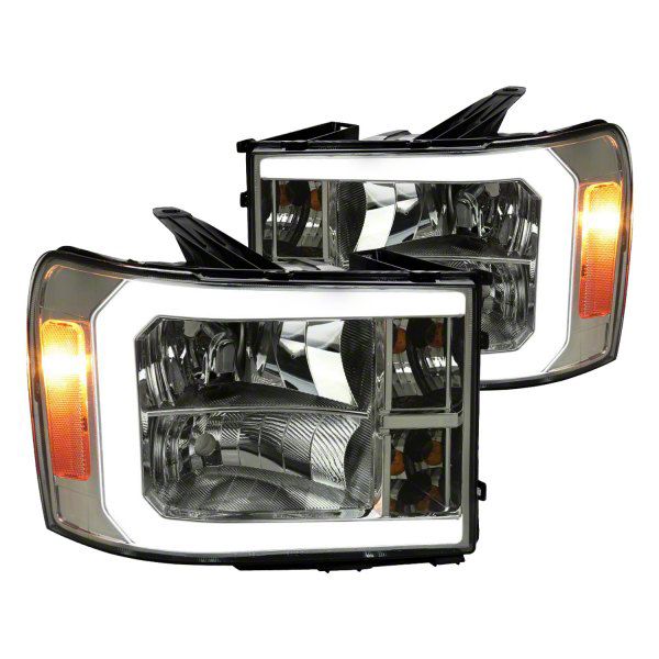 Construction and Appearance. These headlights are built with durable materials and a polished chrome finish housing that complements the vehicle’s design. The smoked black lens adds a bold, aggressive look, while the integrated LED bar design enhances nighttime visibility and aesthetics, making them both stylish and practical.
