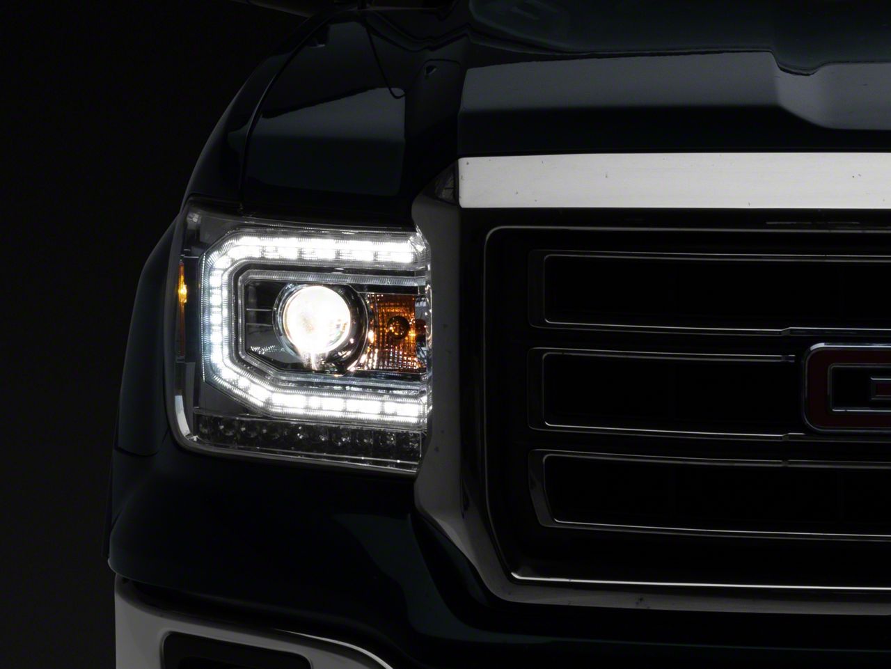 Modern Styling. A pair of chrome LED DRL Projector Headlights are an excellent way to add an updated modern appearance to your 2500 Sierra, all while improving your nighttime visibility. With an impressive DRL Light Bar design and sequential LED turn signals, these Headlights will give your Sierra a whole new look.