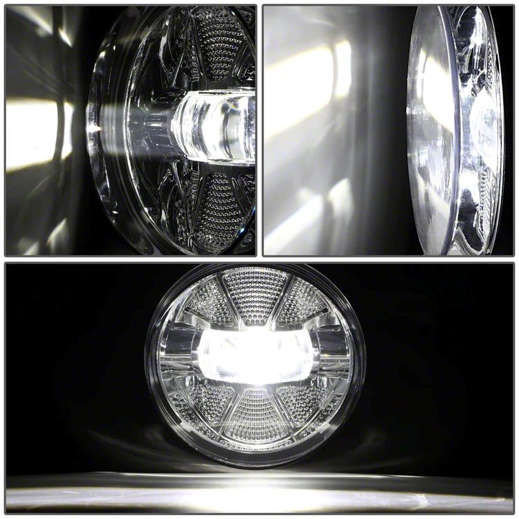Construction and Appearance. Each fog light features a clear transparent polycarbonate lens housed in a polished chrome ABS plastic shell, combining durability with a factory-style shine. The projector-style LED beam offers superior light focus compared to conventional halogen fog lights, while also improving longevity and energy efficiency. The rugged lens resists cracking and yellowing from road debris and UV exposure.