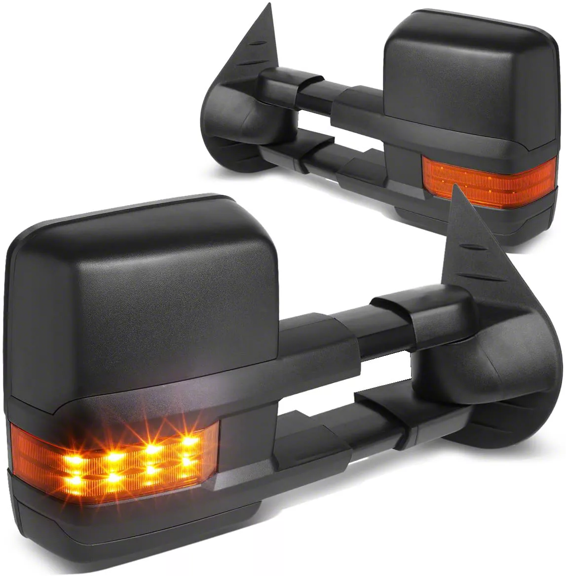 Construction and Appearance. This towing mirrors, sold as a pair, are power adjustable with heating elements to defrost the mirrors. They feature black housings, amber LED turn signals, and varying angles for optimum viewing.