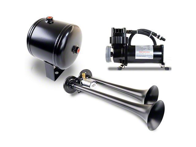 Description. Compact high performance onboard air system and dual black truck horn with two all metal trumpets 16.75? and 14.5? in length and a corrosion resistant finish. Think fire truck or ambulance horn but LOUDER! The flat design allows for easy mounting behind the grill, in the engine compartment or on a frame rail. The kit includes a 150 PSI waterproof onboard air system with 0.5 gallon air tank and quick connect tire inflator with storage bags. Easily inflates 37” tires as well as UTV tires.