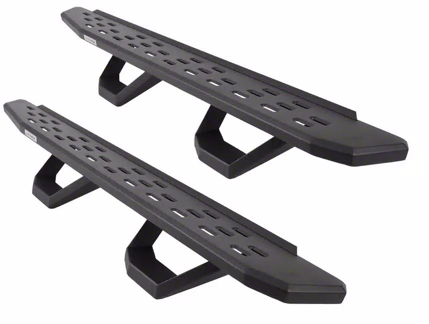 Inspired by the Ford Raptor design, the Go Rhino RB30 Drop Step Running Boards offer an aggressive, stylish upgrade to your ride! These cab length running boards will weather impacts and corrosion with their zinc plated galvanized 16-gauge steel construction. The RB30 drop step running boards come with your choice of protective bedliner style coating or textured black powder coat finish. These running boards provide a wide 7" stepping surface that runs most of the length and tapers towards the ends with flow-through slots that prevent the build up of dirt, ice, mud and snow. Included with the running boards are 4" drop steps that easily bolt on and will come in either a single or two pairs depending on your vehicle application. Finished with stylish angles, a boxed end design, and weight rating of up to 600 lbs per side, these running boards will stand firm to the elements and give your vehicle a look that will stand out from the rest.