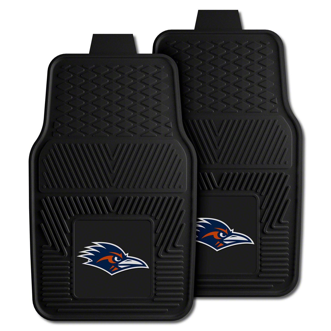 Vinyl Front Floor Mats with University of Texas at San Antonio Roadrunner Head Logo; Black (Universal; Some Adaptation May Be Required)