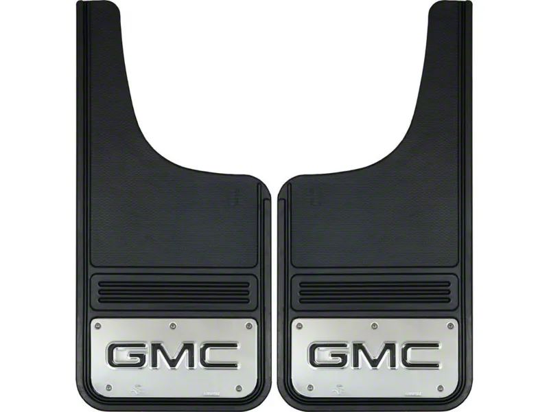Durable Mud Flaps. The 12-Inch x 26-Inch Mud Flaps with Black GMC Logo provide additional protection from debris and enhance the vehicle's aesthetic. Suitable for both front and rear applications, these mud flaps are engineered for universal fitment.
