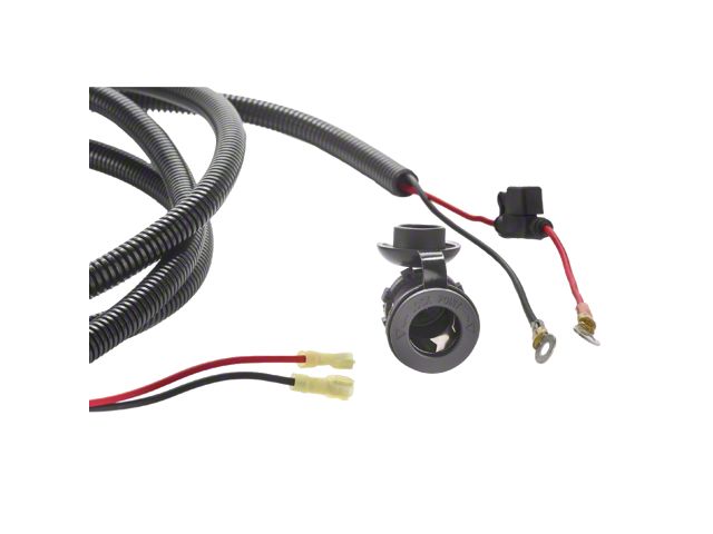 Construction and Features. Featuring a matte black finish, this 12-volt power outlet includes a 20-foot long dedicated wire harness with an in-line 20-ampere fuse for reliable power delivery. Heavy-duty sealed ring terminals ensure secure connections, while the waterproof cap provides protection against moisture and debris. Designed to fit into a 1-1/8-inch hole, this power outlet is built for durability and practicality.
