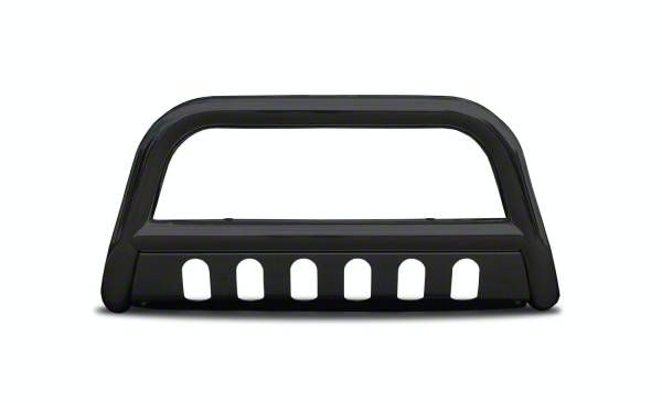 Steelcraft Bull Bar highlights include heavy duty one piece construction, pre-drilled holes for auxiliary lights, removable skid plate, and easy no drill installation. Semi gloss black finish with 3 year warranty