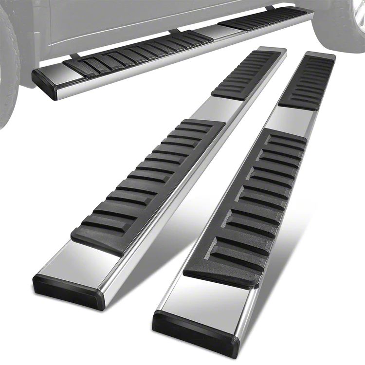 Structural Integrity. Built to withstand the elements, these running boards are corrosion-resistant, maintaining their polished finish and structural integrity over time. Designed for direct bolt-on installation, the running boards fit perfectly onto your ride without the need for drilling or modifications. Each board can support up to 300 pounds, making them suitable for both light and heavy-duty use. With all necessary mounting hardware included, these running boards offer a straightforward upgrade that enhances both the functionality and appearance of your vehicle.