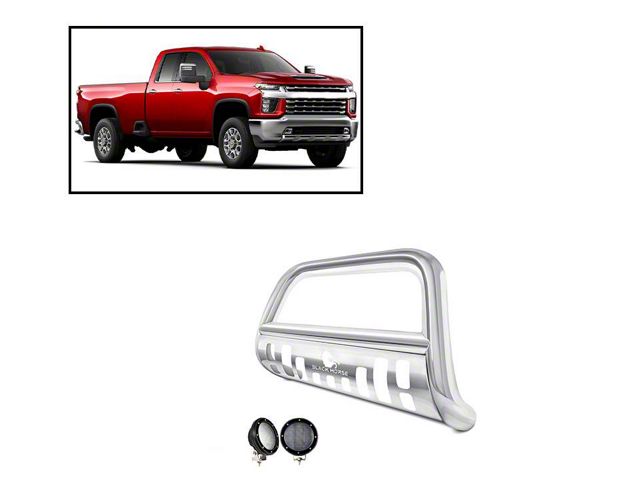 Description. Polished Stainless Steel Bull Bar Kit (BBGT30-SP-PLFB) by Black Horse Off Road compatible with 2020-2022 Chevrolet Slverado 2500 HD 3500 HD / 2020-2022 GMC Sierra 2500 3500 HD. No-Drill/ Vehicle-Specific Application for Custom Fit. Environmentally friendly option to chrome-plating. Solid frame-mounted bolt-on. Welded 1-piece construction. Rust-resistant Stainless-Steel, mandrel-bent tubing. Removable skid plate. Comes with a set of 5.3” Black Round Flood LED Lights. Includes Installation Instructions & Mounting Brackets & Hardware. May interfere with front sensors if equipped. Limited Lifetime Manufacturer’s Limited Warranty.