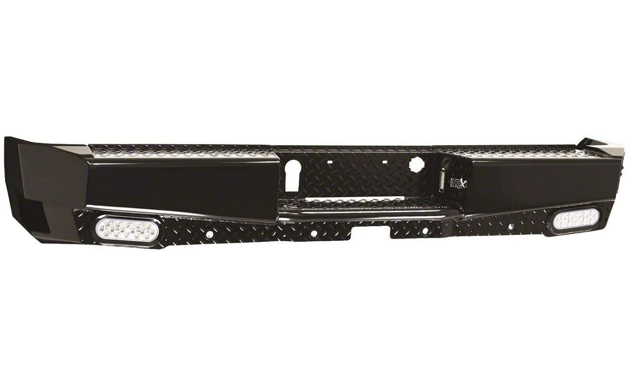 Functional Design. A unique corner step design provides an extra-wide step area to allow easy access to the bed and cargo area. HDX Bandit Rear Bumper includes hardware, mounting brackets, flush-mount LED license plate lights and two standard LED backup lights. Fully compatible with blind-spot monitors and parking sensors.