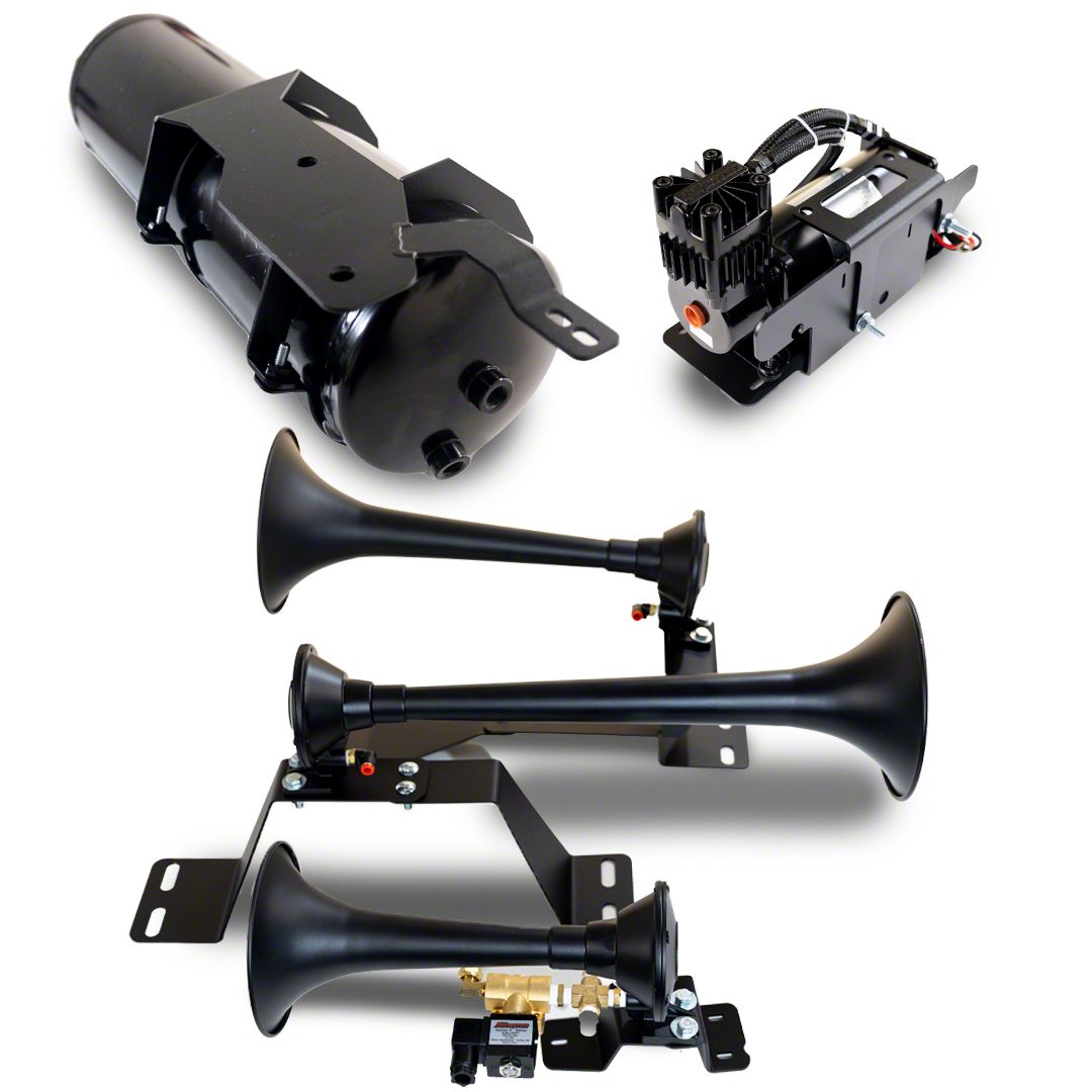 High-Performance Train Horn and Air System. The Direct Fit Onboard Air System includes the powerful Model 730 Demon Triple Train Horn, capable of producing an impressive 157.8 decibels. This system is perfect for delivering a loud and clear signal, while also offering the convenience of an onboard air compressor for inflating 37-inch tires.