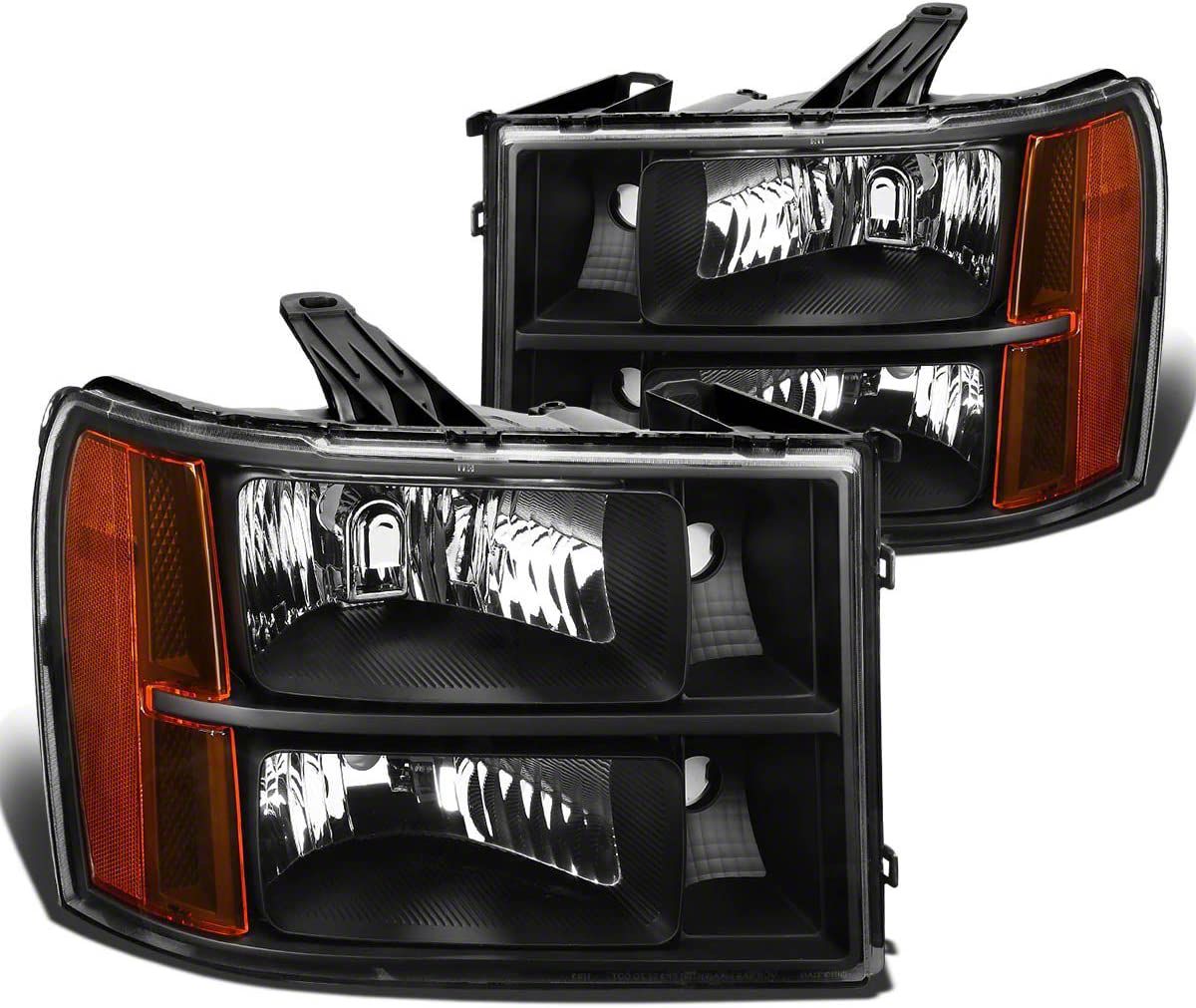Reliable Illumination. Upgrade your Sierra 3500 HD's style and visibility with the Headlights with Amber Corners; Black Housing; Clear Lens. The black housing adds a touch of sophistication, while the clear lens enhances the brightness of the lights. Featuring amber corner lenses, these headlights not only contribute to your vehicle's aesthetic but also improve visibility, especially during turns and low-light conditions. The combination of black housing and clear lens creates a distinctive look that sets your car apart.