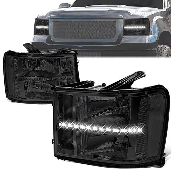 Application. This LED DRL Strip Headlights with Clear Corners in Chrome Housing and Smoked Lens fits all 2007-2014 Sierra 3500 HD models.