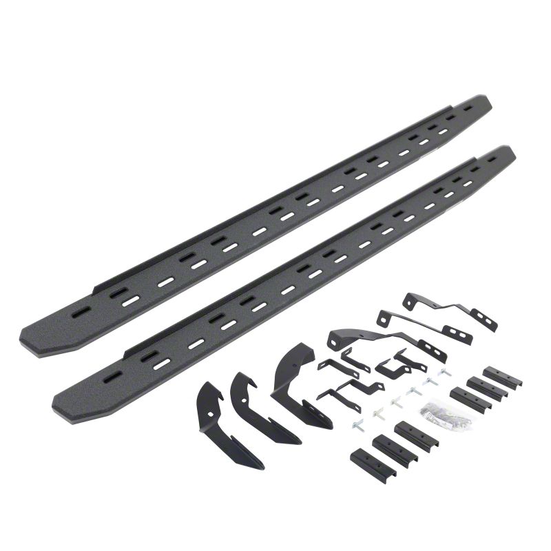 Description. Meet the third edition of the legendary Go Rhino RB Series of running boards: the RB30 Slim Line Running Boards. The RB30 is the next generation of Raptor-inspired design that will make your truck, Jeep, Bronco or SUV stand out from the crowd. With its aggressive, stylish appearance, this cab-length, bolt-on side step provides maximum traction and features an open flow-through design that prevents mud, ice, and snow from accumulating. The RB30 Slim Line Running Board offers the same heavy duty toughness as the original-width RB30, but with a slimmer design that fits tighter along the cab for increased ground clearance when off-roading. The RB30 Slim Line is 5” wide for most its length before it tapers (compared to 7” wide for the original-width). The corrosion-resistant 16-gauge steel step mounts tightly to factory mounting points along the lower rocker panel and it’s strong enough to support 300 lbs. per stepping surface for 600 lbs. per board. All RB Series Running Boards are available in Textured Black Powder Coat or Protective Bedliner finish, made in North America and offer a limited lifetime warranty against manufacturer and material defects, with a 5-year warranty on the finish.