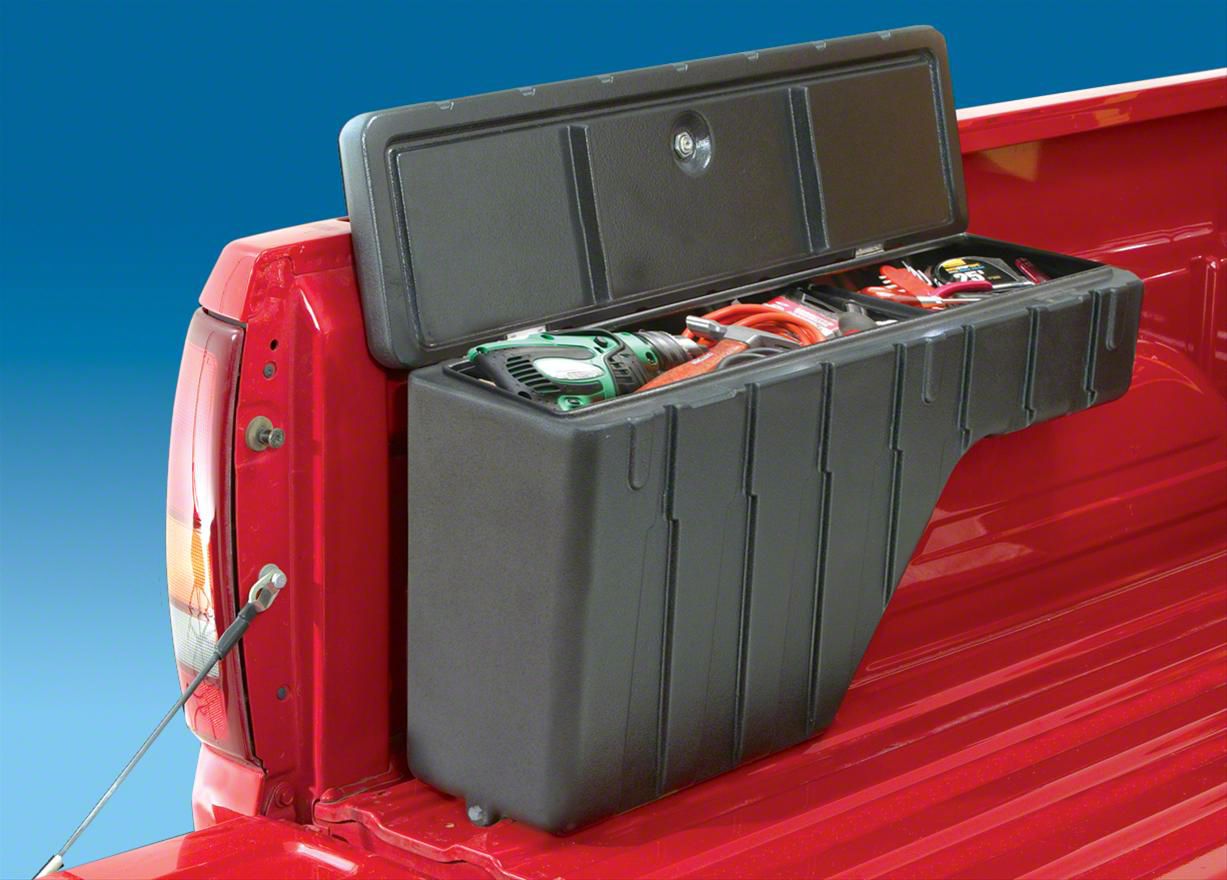 Extra Storage. A practical cargo solution for the bed of your truck is a Wheel Well Storage Box. Designed to make use of the dead space in your truck's bed, this Storage Box features two divided storage areas that can be used for either dry or wet storage. With a keyed lock, this Wheel Well Storage Box is ideal as tool box or you can fill it with ice for a day of camping or tailgating. The beveled bottom design and a built in valve allows it to be easily drained at the end of the day.
