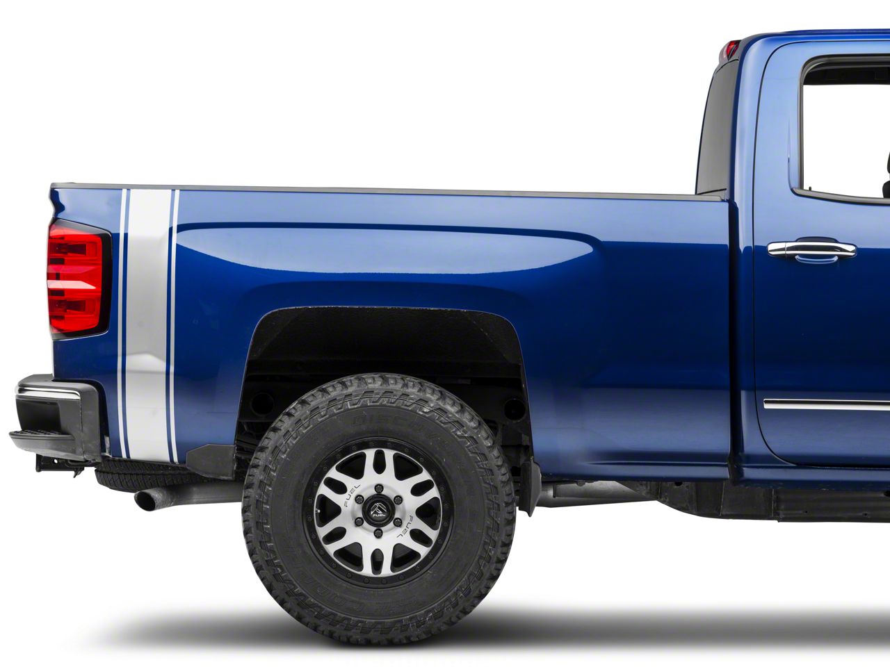 Sport Truck Styling. Transform the appearance of your Chevrolet Silverado from a boring grocery getter to a fun sport truck with a set of these great looking Vertical Tail Stripe Decals from AmericanTruck Graphics. Featuring one wide vertical stripe flanked by a thinner stripe on either side, these gloss silver Tail Stripe Decals will give your 2007-2026 Silverado a much sportier appearance.