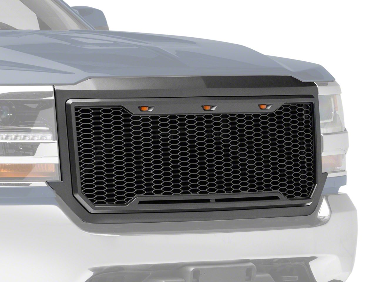 Powerful Baja Styling. Add powerful Baja styling to the front end of your 2016-2018 Chevy Silverado with a charcoal gray RedRock 4x4 Upper Replacement Grille. Featuring a honeycomb style pattern, this Baja inspired Grille includes three integrated LED accent lights across the top for a rugged appearance. Designed to be installed in place of your factory grille, this RedRock 4x4 Grille will transform the appearance of your Silverado from a mild mannered daily driver into a mean Baja machine.
