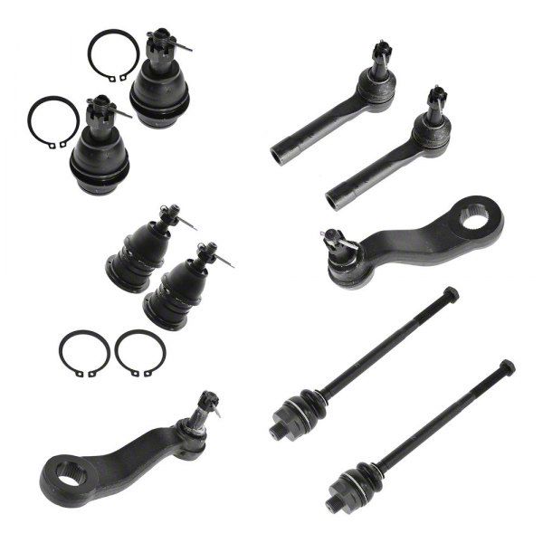 Complete Suspension Repair. The 10-piece steering and suspension kit for 4-groove Pitman Arms delivers comprehensive replacement components designed to restore steering and suspension performance. It includes the Pitman arm, idler arm, two front lower ball joints, two front outer tie rods, two front upper ball joints, and two front inner tie rods, making it ideal for repairing worn or damaged parts to ensure safer and more responsive vehicle handling. This kit is essential for maintaining vehicle stability and steering control.