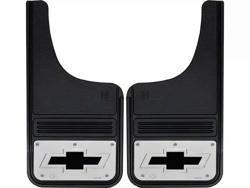 All-Weather Mud Flaps. Constructed from a heavy-duty rubber material, these mud flaps are highly durable and can withstand harsh weather conditions, road debris, and other elements that can damage your vehicle's paint and body. They feature a stainless steel plate with the iconic Bowtie logo, adding a touch of style to your ride while also serving a practical purpose.