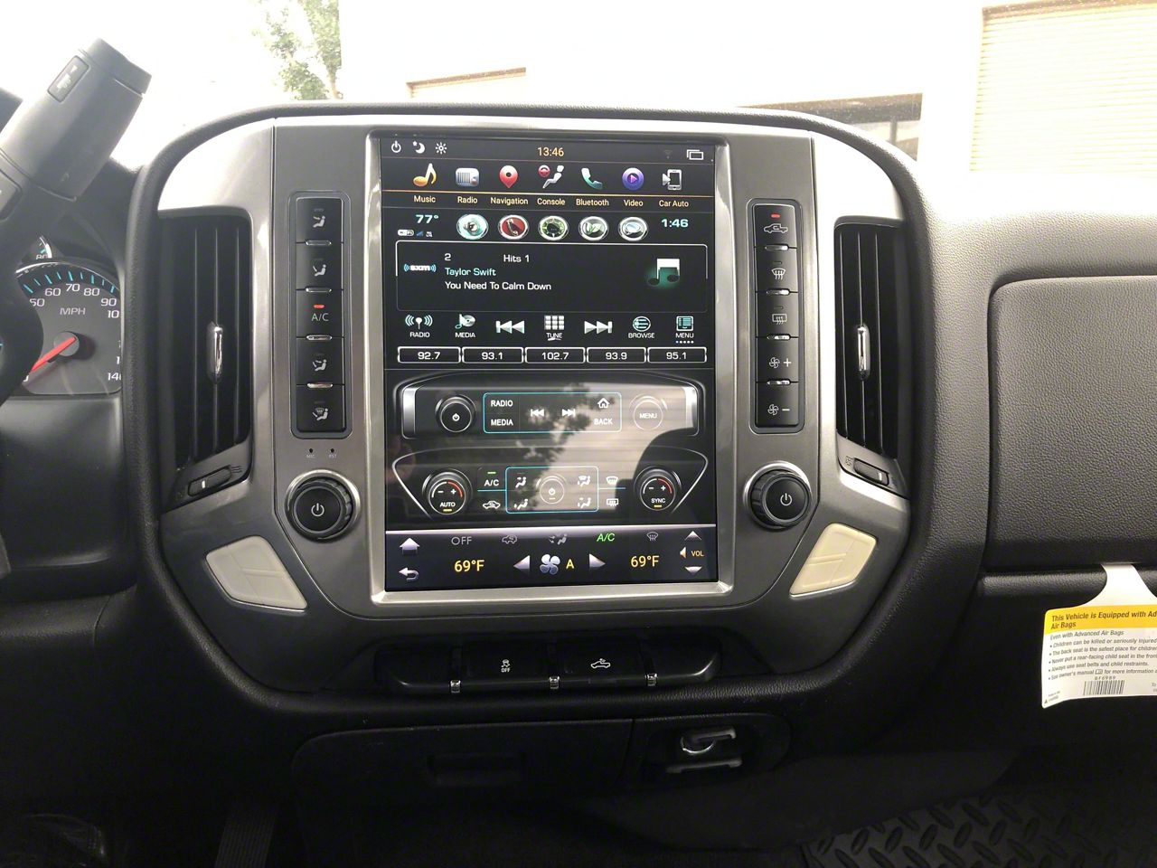 Easy Control. With its 12.10-inch touch screen, accessing this radio's menu and controls is a breeze. Two physical buttons control the A/C and make temperature adjustment easy. Use of the steering wheel controls and other stock electronics are also retained with this unit.