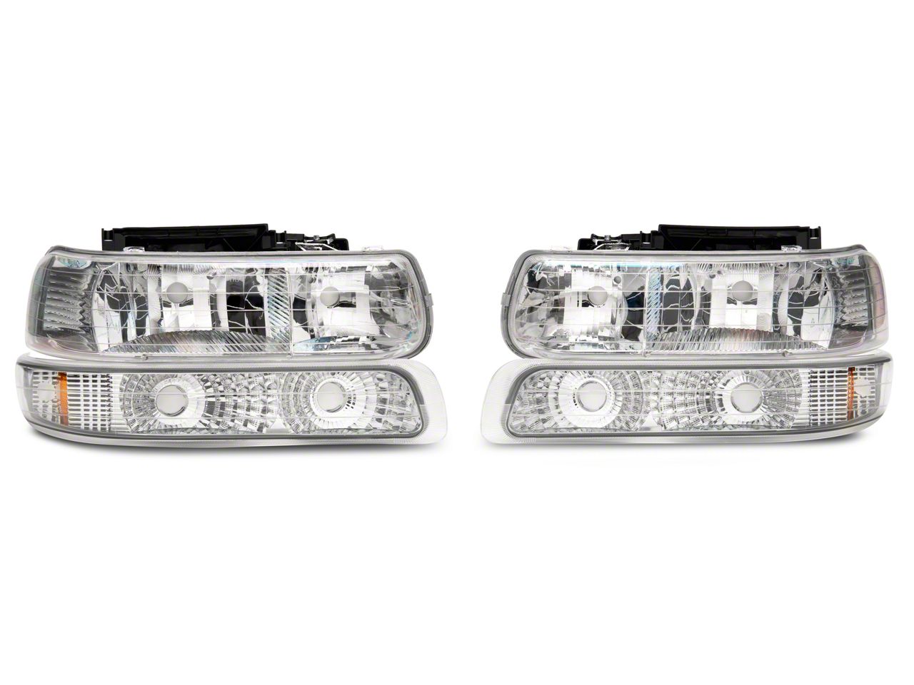 Application. These 4-Piece Headlights with Amber Corner Lights; Chrome Housing; Clear Lens are designed to fit 1999-2002 Chevrolet Silverado 1500 models equipped with halogen headlights. Driver and passenger side included. Reuses factory bulbs.CA Residents: WARNING: Cancer and Reproductive Harm - www.P65Warnings.ca.gov