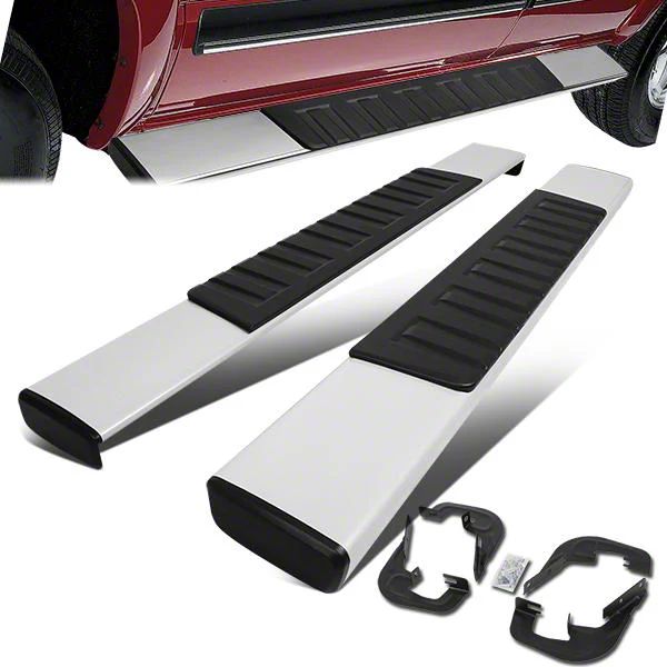 Construction and Appearance. Made from high-strength steel, these running boards are built to last, with a silver powder-coated finish that resists corrosion and adds a sleek, metallic look to your truck. The non-slip surface ensures stability, even in wet conditions.