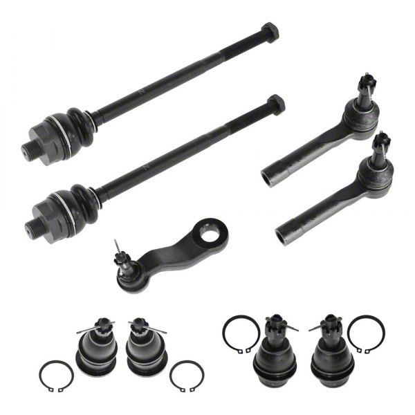 Complete Suspension Solution. The 9-Piece Steering and Suspension Kit offers a comprehensive front-end repair by including ball joints, tie rods, and a pitman arm to effectively restore steering and suspension performance. It is engineered to replace worn or damaged components, ensuring improved vehicle handling and safety. This kit is ideal for servicing multiple front steering and suspension parts simultaneously.