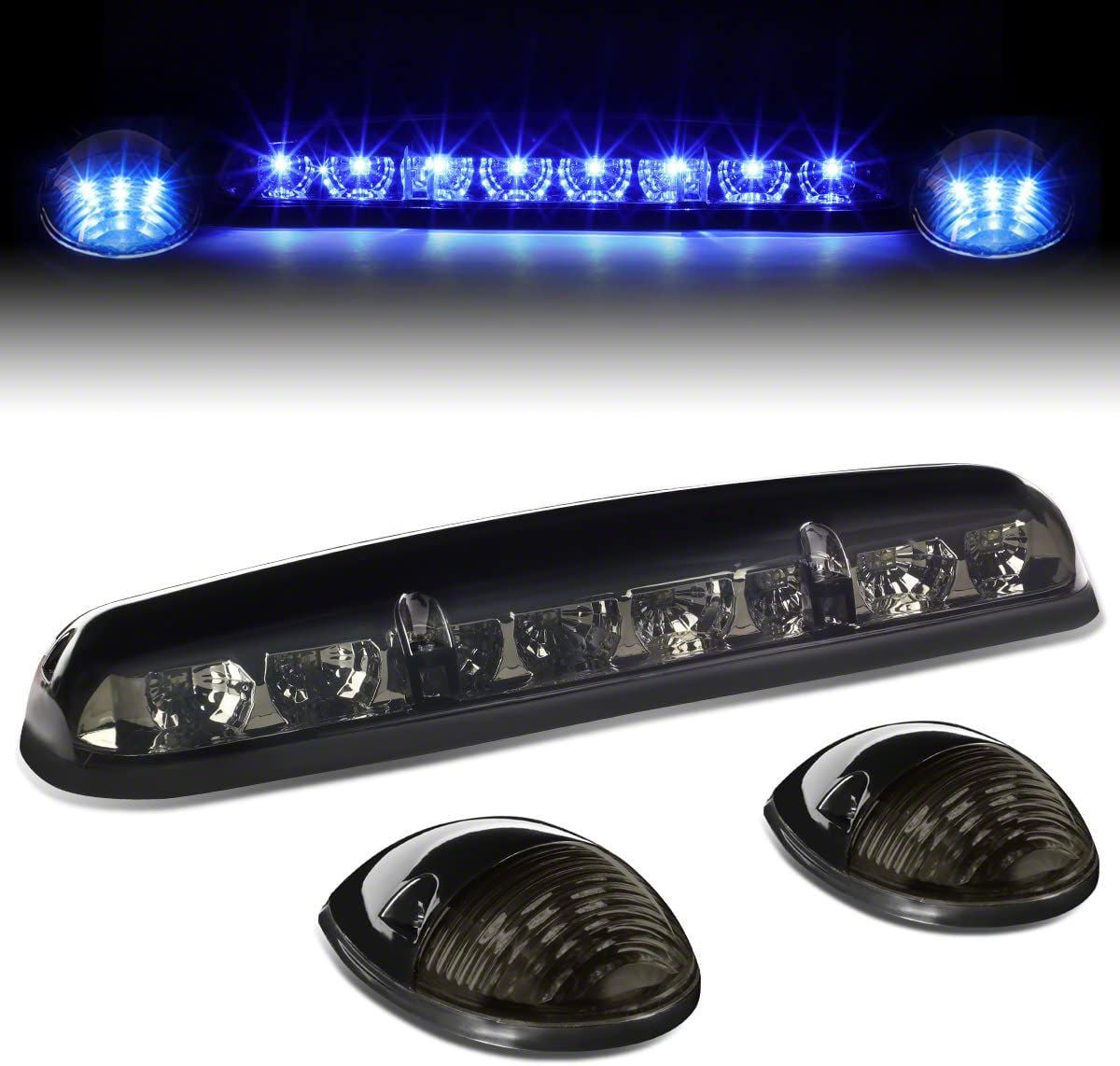 Blue LED Cab Roof Lights. The Blue LED Roof Cab Lights is a set of smoked lens cab roof lights designed for 2002-2006 Chevrolet Silverado 1500 models. These lights feature super bright blue LEDs that enhance the vehicle's visibility during nighttime, heavy rain, fog, and other low-visibility conditions. The set includes one center lamp and two side lamps, providing a complete lighting solution for the cab roof.