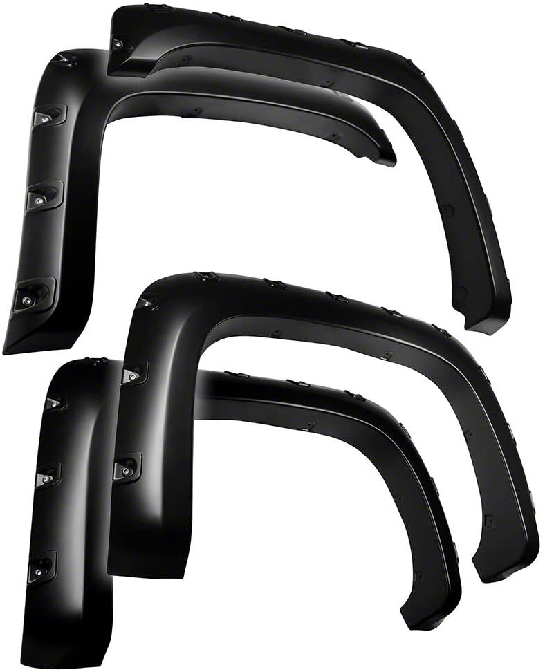 Enhanced Off-Road Appeal. The pocket bolt-on riveted style adds an aggressive, off-road look that commands attention. With a UV-resistant, fine-textured matte black surface finish, these fender flares offer durability and a sophisticated appearance that complements any color scheme. For those looking to customize their truck further, these fender flares can be easily repainted to match your vehicle's exact color.