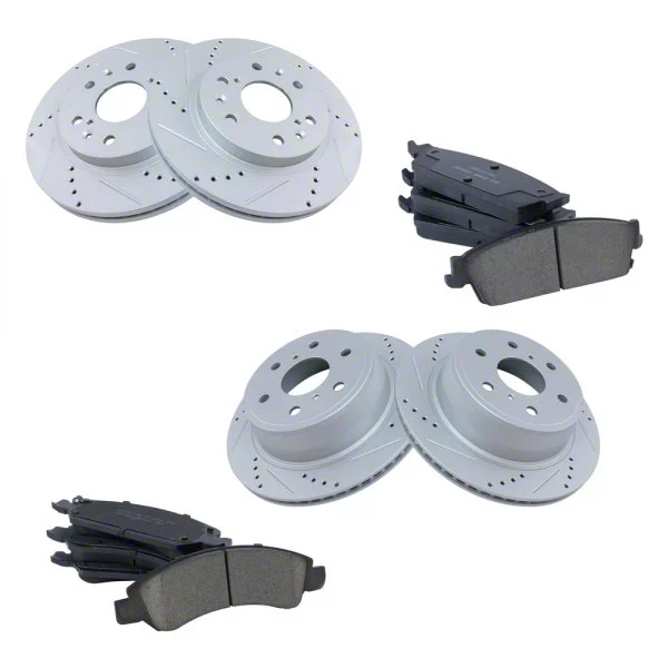 Performance Ceramic Front and Rear Brake Kit (BKA15680) by TRQ®. Upgrade the performance of your steel stallion and enjoy every mile of your trip safely and confidently by upgrading your old, factory brake parts with this TRQ ceramic brake kit. Engineered for peace of mind, this kit includes perfectly matched components that offer trouble-free installation, saving you time and money. Made from premium-grade materials in state-of-the-art facilities, TRQ ceramic brake parts deliver better stopping power, ensure longer life, and create less dust.