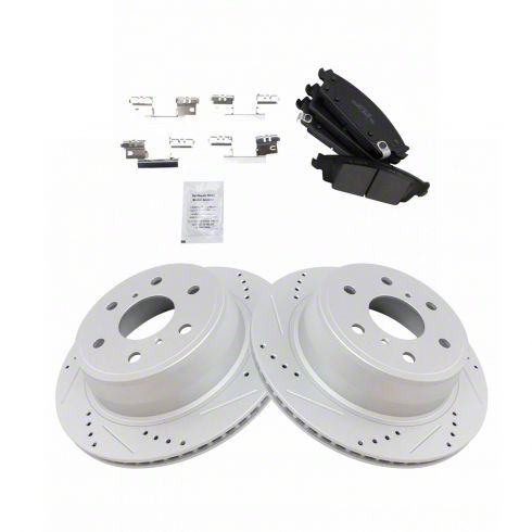 Construction and Appearance. This high-quality kit features cross-drilled and slotted rotors with a non-interference vane design. The rotors are positive-molded and come with multi-layer shims to reduce noise and vibration, offering long-lasting service and superior performance.