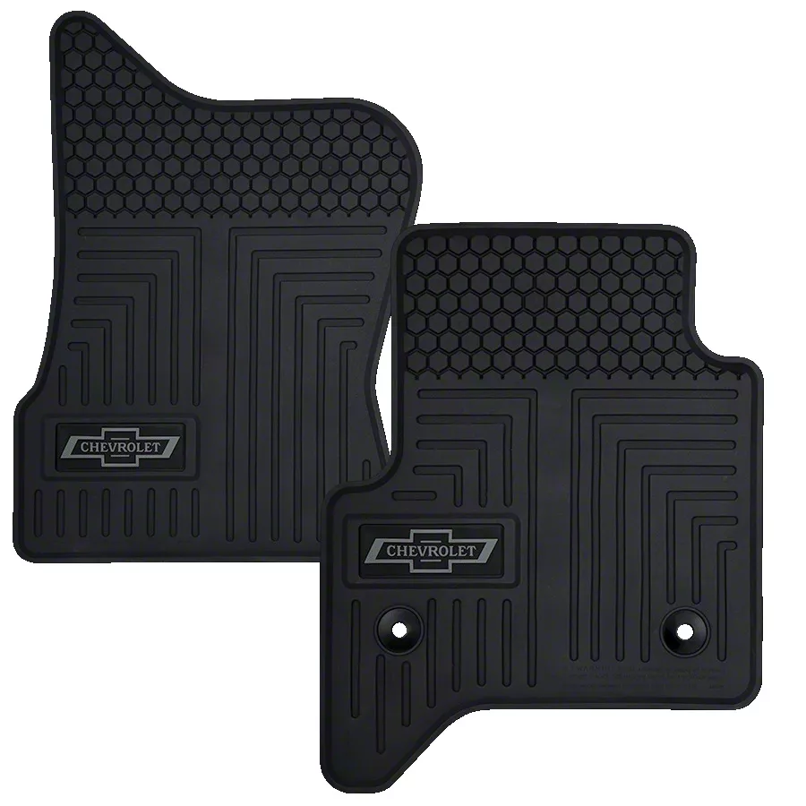 Premium Floor Protection. The Custom Fit Front Floor Mats with Bowtie Logo provide durable and stylish protection for your vehicle's interior. Specifically designed for Chevrolet Silverado 1500 HD models, these mats combine functionality with aesthetics, featuring a sleek black finish and the iconic Bowtie logo.