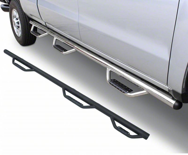 Description. Dominator hoops now feature a wider and more slip resistant step pad. Punched steel step pads offer extra grip. NEW one-piece design. Wheel-to-wheel Side Steps made of 3" round tubing. No drilling required on most applications. Body lift kit compatible. 3
