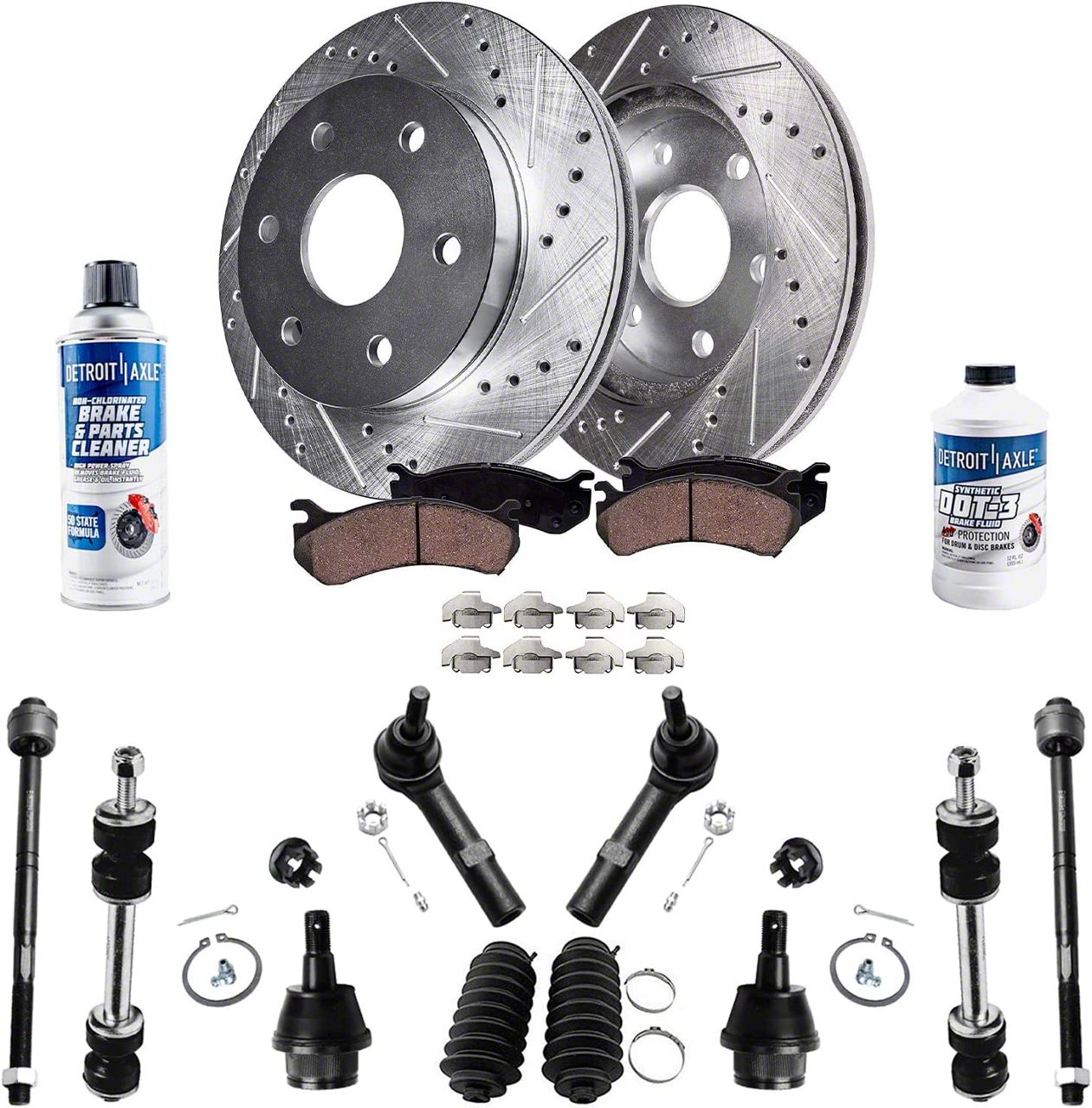 Comprehensive Upgrade Solution. This all-inclusive kit for the Silverado 1500 models offers a comprehensive solution for front-end maintenance and performance enhancement. The kit includes polished chrome finish drilled and slotted 6 lug rotors, matte black finish ceramic compound brake pads, matte black finish tie rods and sway bar links, along with a bottle of brake fluid and cleaner. Designed and built in an ISO9002 certified facility, each component is impact, wear, and fatigue tested to ensure durability and reliability. This direct replacement kit not only upgrades the braking performance but also improves the vehicle's handling and stability, providing an all-around enhancement of the driving experience.