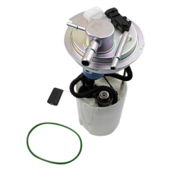 Construction and Appearance. Manufactured using durable materials, this module features a corrosion-resistant design with carbon brush and commutator elements for extended service life. It includes fluorine rubber seals that withstand high temperatures, fuel, and solvent exposure. The module appears as a complete pre-assembled electric pump with a strainer and quick connect outlet for easy integration.