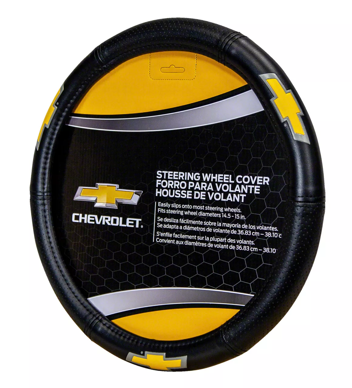 Construction and Appearance. Crafted from durable, padded leather-like material, this steering wheel cover is built to last while offering a premium feel. The metallic gold Bowtie logo adds a distinctive and elegant touch, while the matte black finish ensures a classic, understated look. Its ergonomic design promotes a secure and comfortable grip, enhancing your overall driving experience.