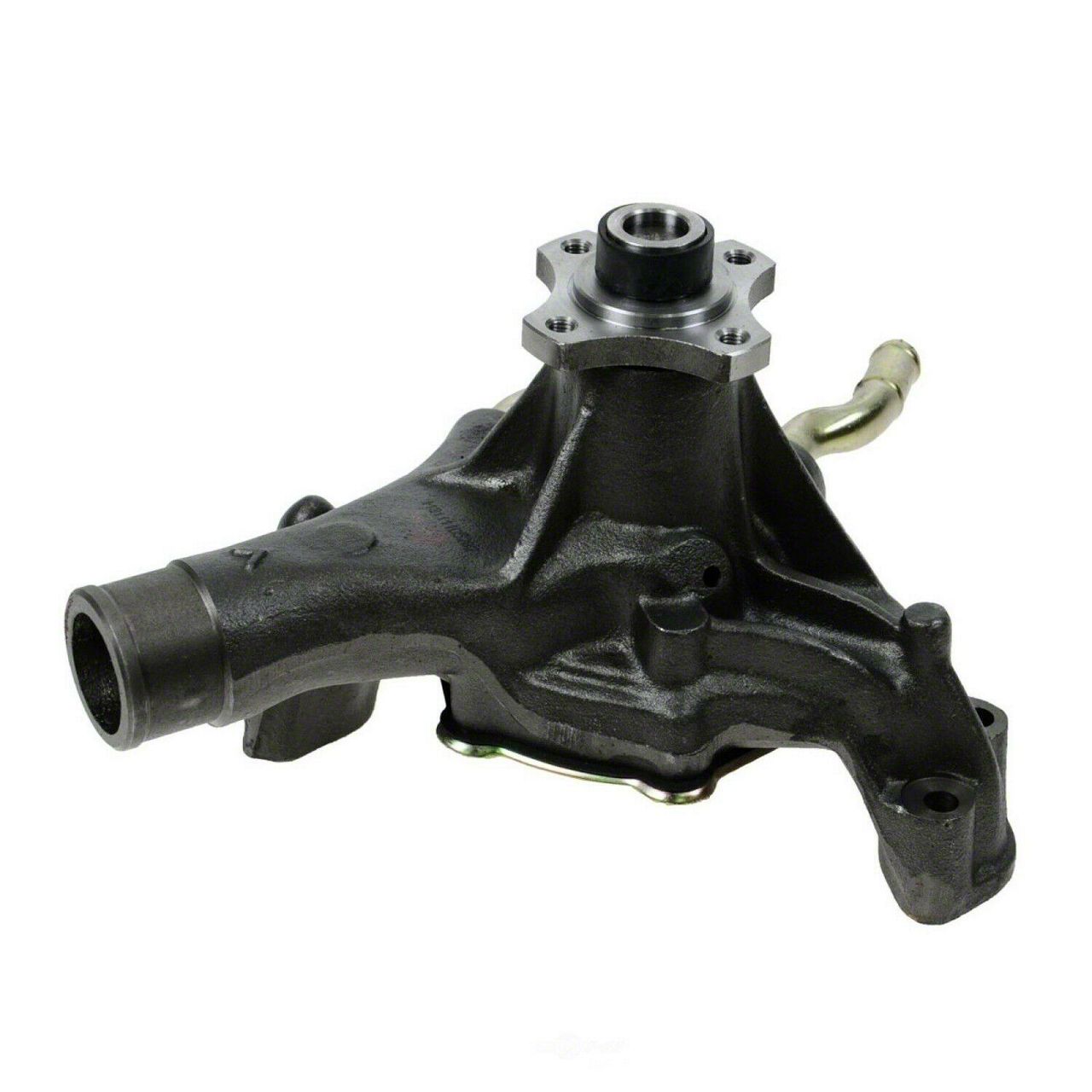 Construction and Appearance. This water pump features a cast iron housing for durability and resistance to wear. The impeller is made from cold rolled steel with six vanes to provide efficient coolant flow. The unit includes four mounting holes and two outlets, with a standard impeller rotation. It comes new and does not include a pulley or fan clutch.