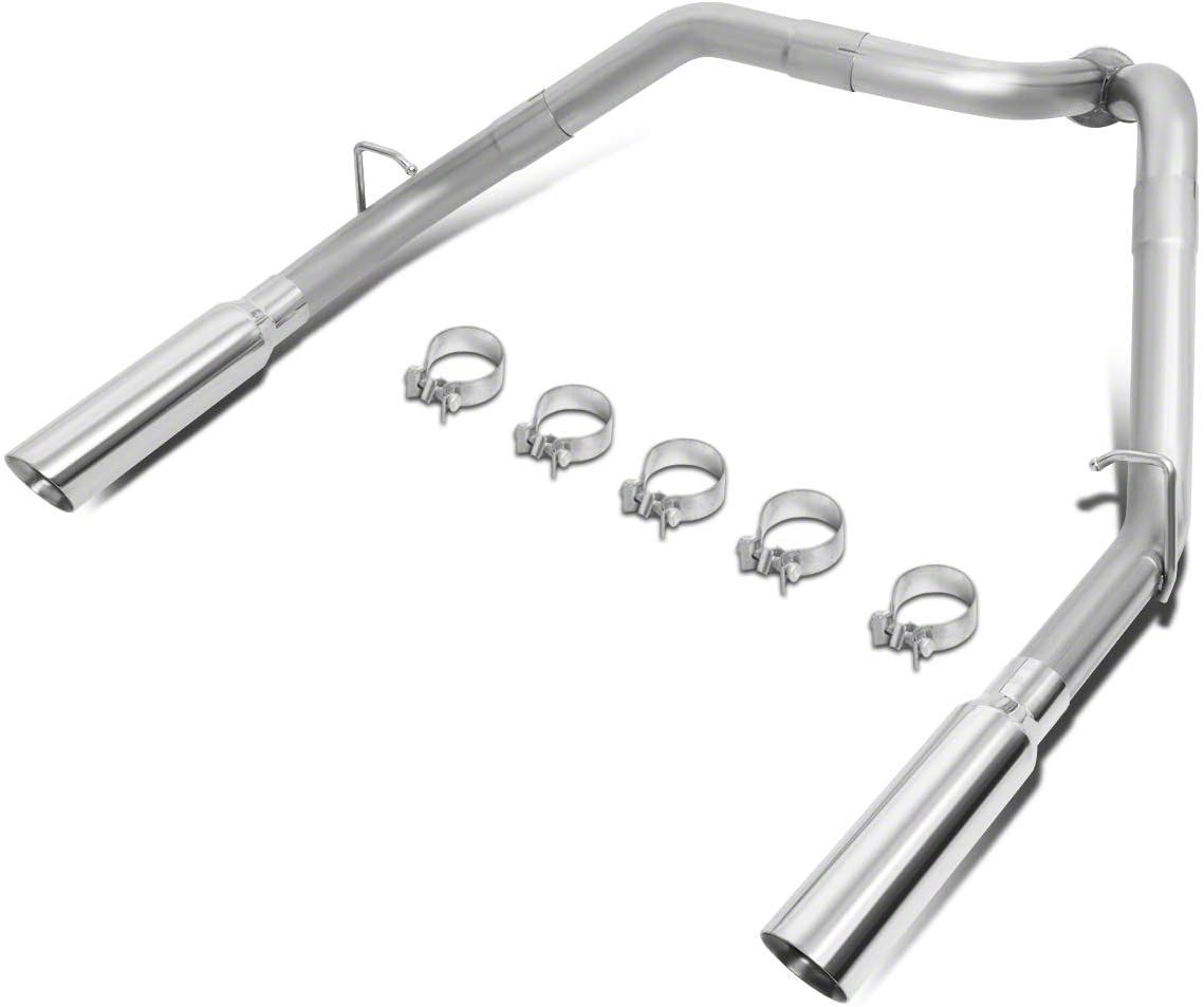 Sturdy Build Quality. This axle-back exhaust feature aluminized steel pipes that start with a diameter of 2.50 inches before transitioning into 3-inch diameter plumbing, offering outstanding flow. Furthermore, these pipes are mandrel bent, eliminating turbulence along their inner surface. Finally, this axle-back system is equipped with diagonal-cut double-walled polished stainless steel exhaust tips measuring 3.50 inches in diameter, giving your truck a classy look.