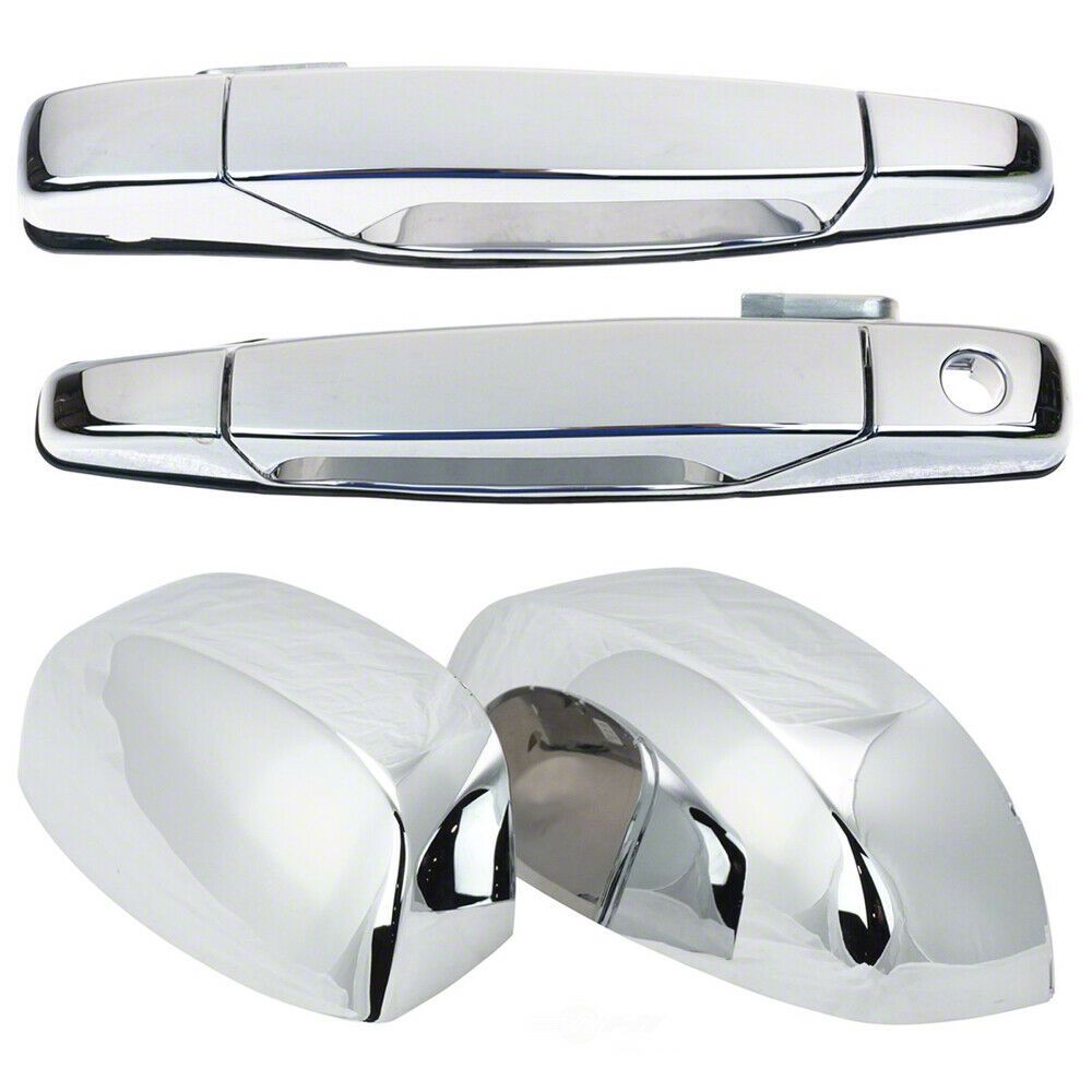 Quality Parts. This Chrome Exterior Door Handle and Mirror Cap Trim Kit is not the normal stick-on trim package. This kit includes the complete door handle assemblies so that the chrome plate is complete on all parts of the handles and the finished appearance is professional. The Side Mirror Caps are clip-on parts that fit over the existing mirrors.