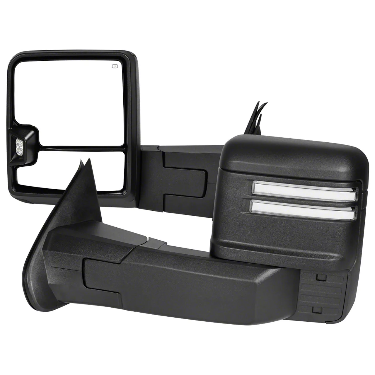Construction and Appearance. A textured black finish housing helps disguise scuffs and reduces glare for a clean, professional look. Integrated clear LED DRL, turn signal, and clearance lights provide crisp, high-contrast illumination that boosts communication with surrounding traffic. The mirrors are engineered with robust electronics for powered adjustment and heating to help clear light frost and fog, while reinforced pivot points support dependable manual folding without excessive play.