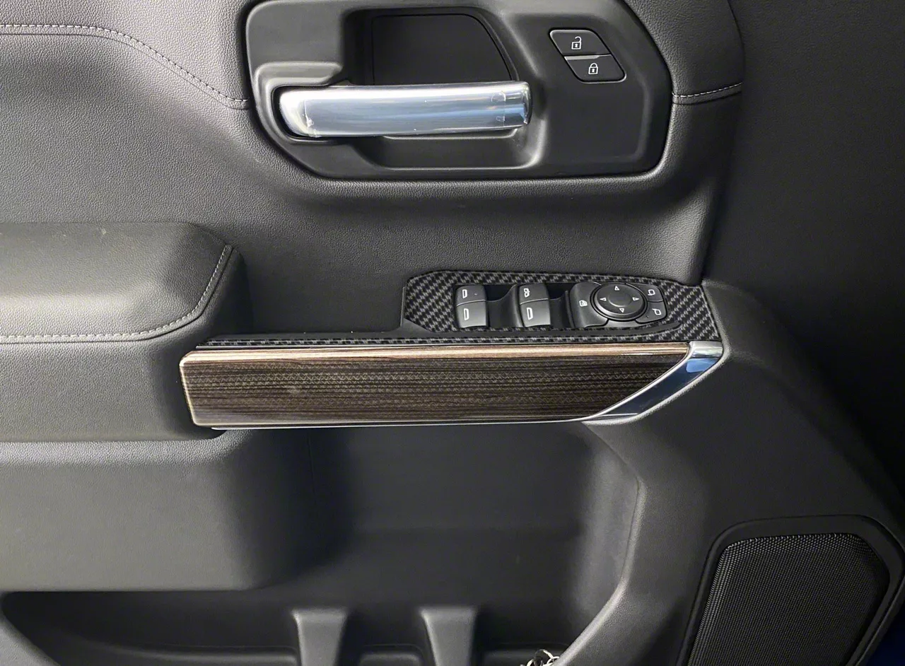 Interior Style in Small Places. When it comes to your Silverado 1500, don't forget the tiny places that could possibly add style dimensions. This Front Door Switch Accent Trim; Domed Carbon Fiber is sold as a pair and the pieces fit on the switch panels of the front doors.