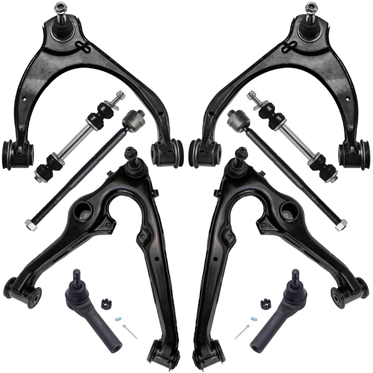 Kit Includes: (2) Front Lower Control Arm w/Ball Joint + (2) Front Upper Control Arm w/Ball Joint + (2) Front Outer Tie Rod + (2) Front Inner Tie Rod + (2) Front Sway Bar Link