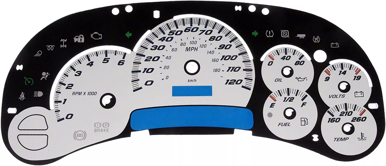 Application. This Instrument Cluster Gauge Overlay without Transmission Temperature; White is designed to fit 2003-2006 Chevrolet Silverado 1500 model without Transmission Temperature
