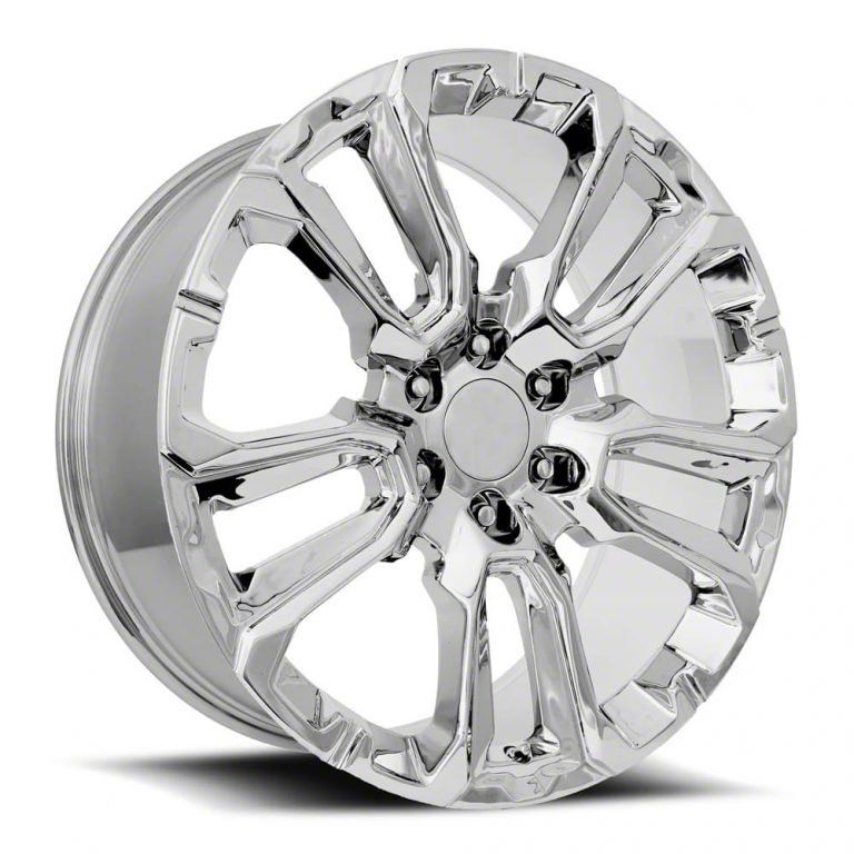 GM Split 5-Spoke Replica Chrome 6-Lug Wheel; 22x9; 28mm Offset: Redefine your vehicle's style with the GM Split 5-Spoke Replica Chrome 6-Lug Wheel. This wheel's elegant design and striking finish embody a blend of sophistication and boldness, perfectly complementing a wide array of vehicle aesthetics. Crafted from high-quality materials, it's a testament to durability and style.