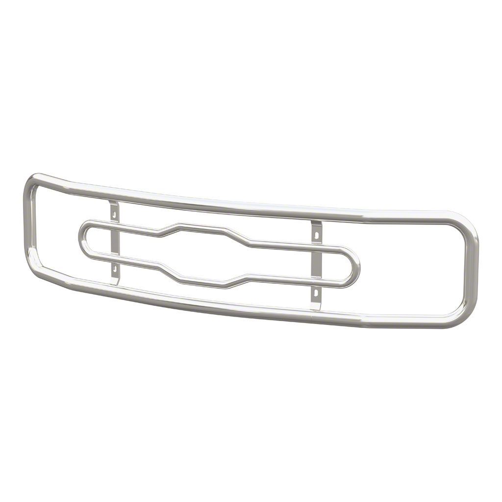 Construction and Appearance. This grille guard features contoured horizontal tubes and a 1-piece tubular steel ring assembly, ensuring durability and strength. Made from carbon steel, it boasts a chrome-plated finish that adds a sleek, polished look to your vehicle.