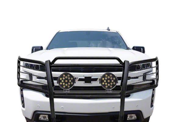 Versatile Style for the Road and Trail. Get versatile style for your Silverado 1500 when you install this Grille Guard with 7-Inch Round LED Lights in Black. Unlike typical grille guards on the market, this assembly features removable side guard wings. This modular design allows you to get a whole new style simply by removing these components. More significantly, this grille guard assembly is built tough using hefty tubular and plate steel, giving you ample protection both on and off-road.