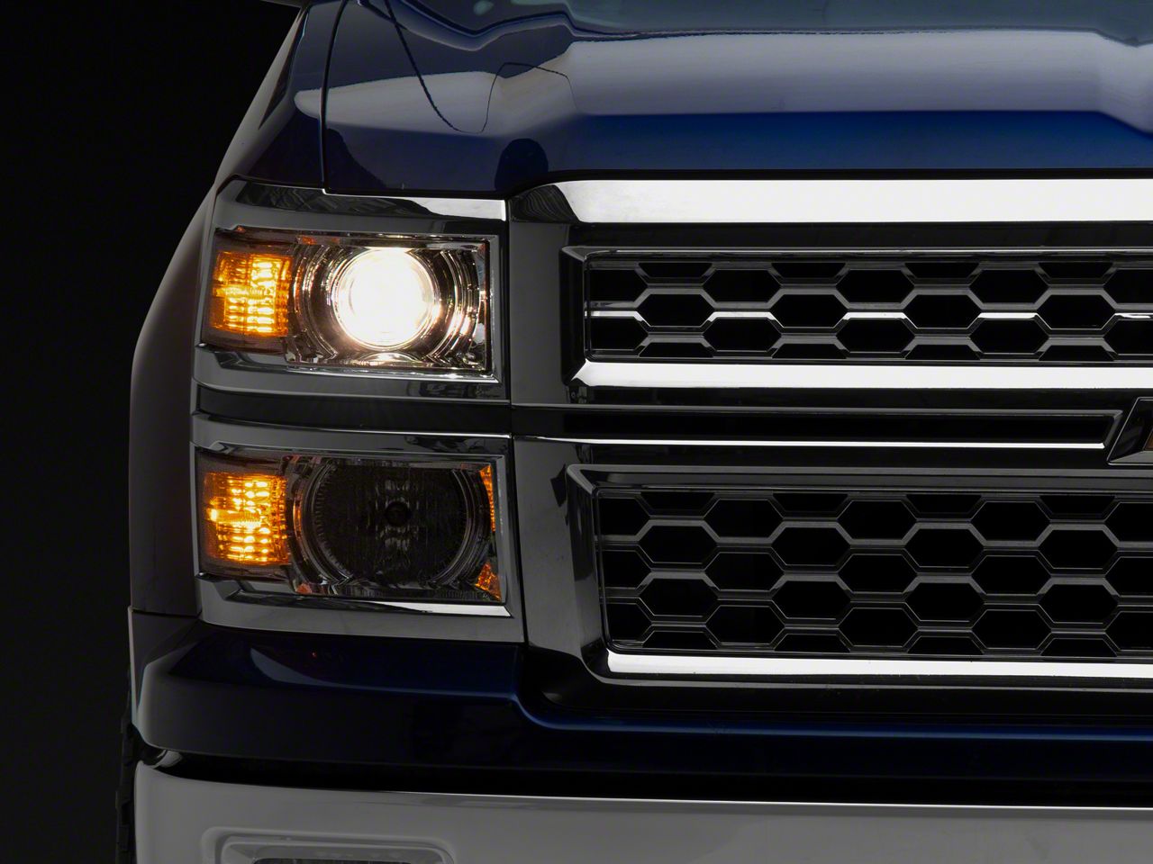 Application. The Projector Headlights with Amber Corner Lights; Chrome Housing; Clear Lens fit all 2014-2015 Chevrolet Silverado 1500 models.