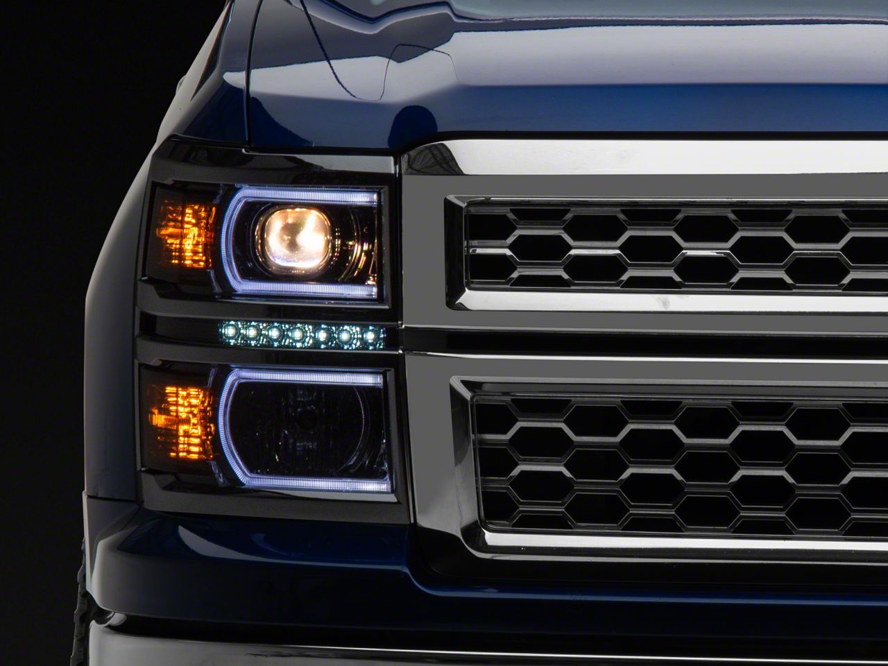 Projector Style Headlights. Add style and safety to your Silverado 1500 with this LED DRL Headlights with Amber Corner Nights; Chrome Housing; Clear Lens. These Projector Headlights let you rock a sporty look on your auto while also giving you a bright view of the road ahead.