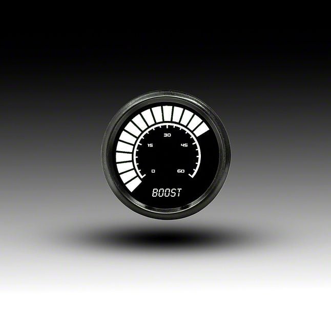 Construction and Features. Featuring a black bezel, this boost gauge is microprocessor-controlled for superior accuracy and reliability. Furthermore, it provides a clear white light output, ensuring easy readability even in low-light conditions. The 2-1/16-inch size offers a compact yet highly visible display, while its 0-60 PSI range accommodates a wide variety of performance applications.