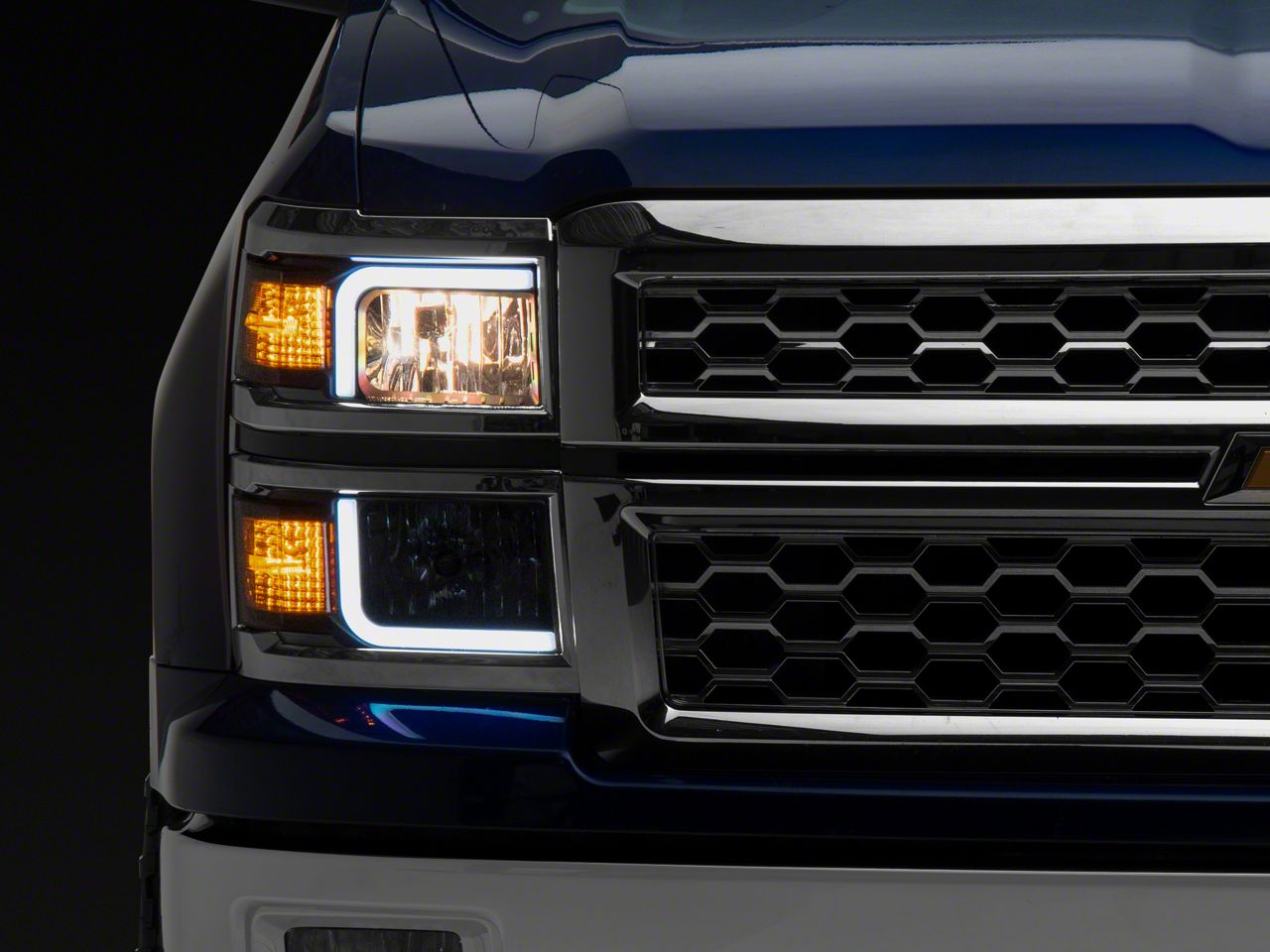 Application. These LED Bar Factory Style Headlights with Bumper Lights; Matte Black Housing; Clear Lens fit all 2014 to 2015 Chevrolet Silverado 1500 models.