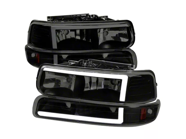 Aggressive Blacked-Out Design. Achieve a blacked-out look when you install these LED Bar Factory Style Headlights with Bumper Lights; Black Housing; Smoked Lens into your Silverado 1500. These headlights’ smoked lenses and black housings make them perfect creating an aggressive all-black style. But don’t let their smoked lenses fool you as these are designed to provide proper forward-facing illumination when out on the trails.
